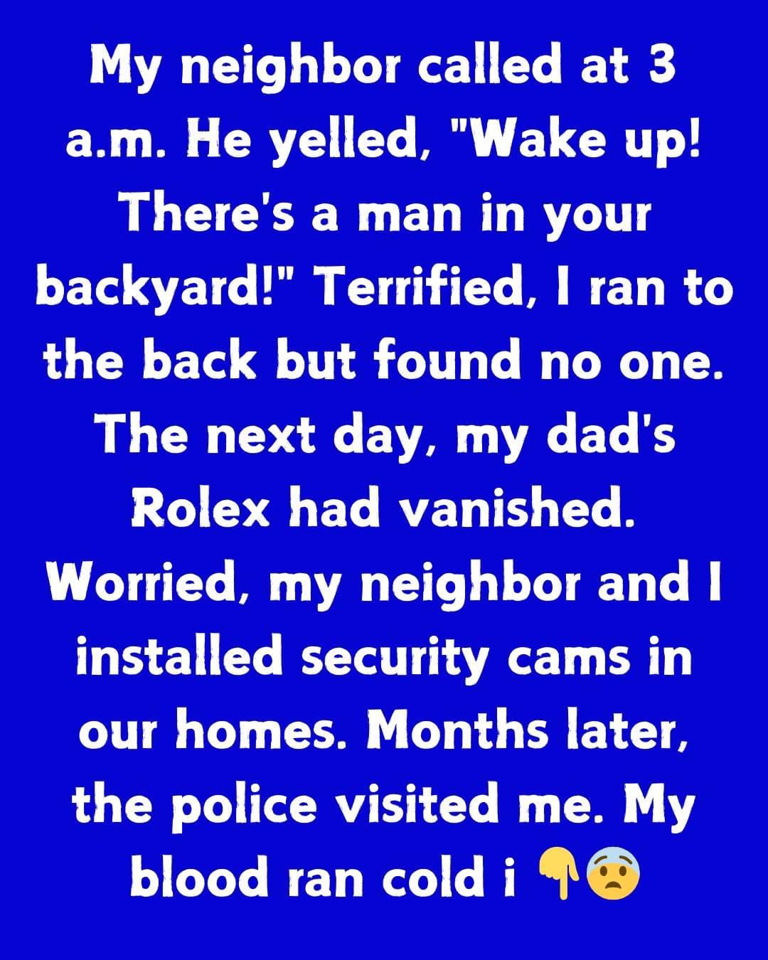There’s a man in your backyard!” Terrified, I ran to the back but found no one. The next day, my dad’s Rolex had vanished. Worried, my neighbor and I installed security cams in our homes.